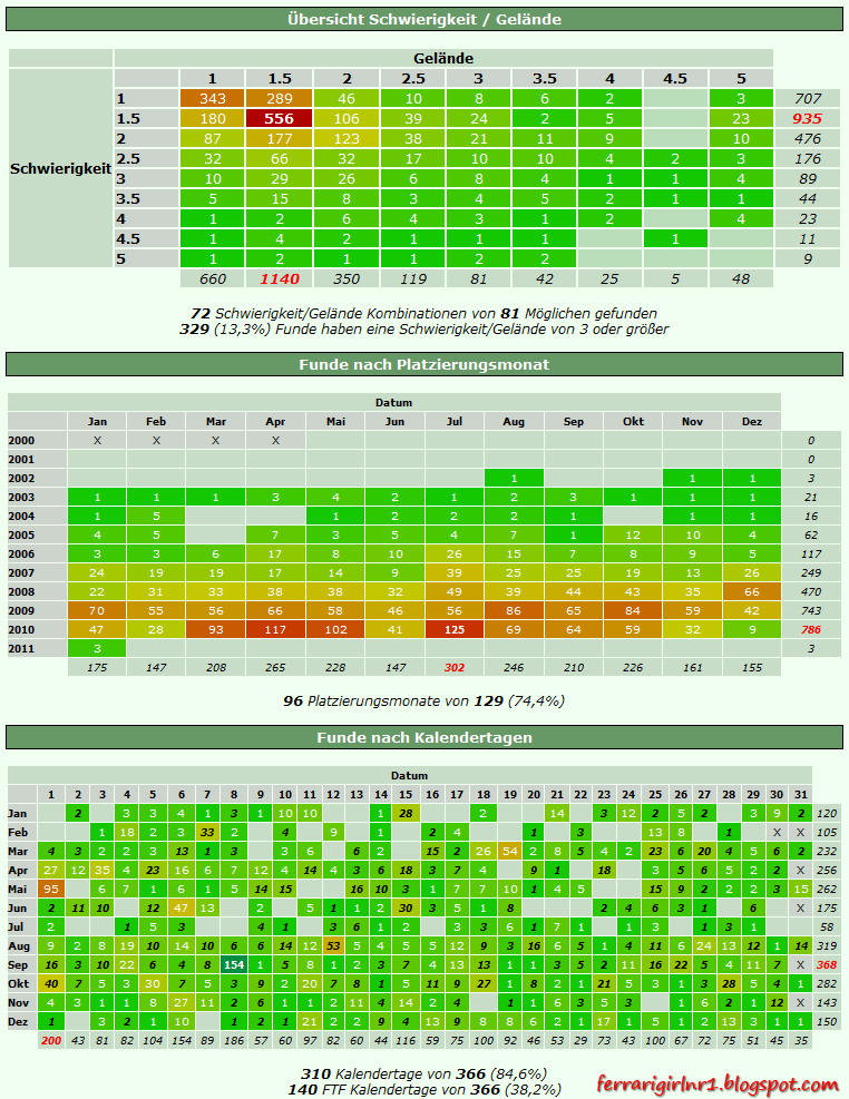 Und nicht zuletzt zu „Funde nach Kalendertagen“: Diese Tabelle auszufüllen erledige ich eigentlich auch eher nebenbei. Cachen gehe ich ja eh viel zu oft, vor allem wenn ein FTF ruft